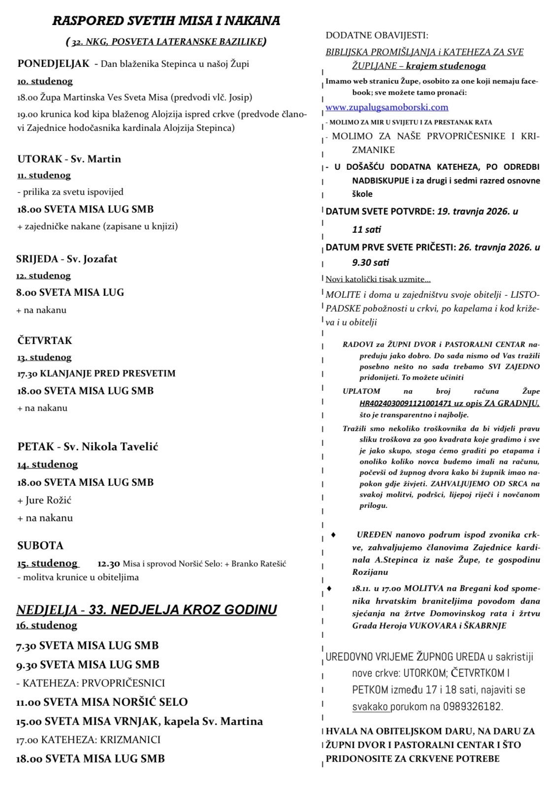 UREDOVNO LJETNO VRIJEME: u sakristiji nove crkve: NEDJELJOM prije ili poslije svetih MISA ili u slučaju hitnosti PORUKOM PETKOM IZMEĐU 17 i 18 sati.